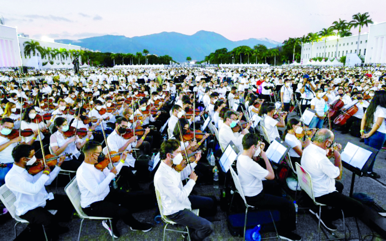أدى نحو 12 ألف موسيقي فنزويلي، أول من أمس، مقطوعة «مارش سلاف» لتشايكوفسكي، سعياً لتحقيق رقم قياسي عالمي لـ «أكبر أوركسترا في العالم»، على أن تعلن النتيجة في الأيام المقبلة. وتجمّع موسيقيو النظام الوطني لفرق الأوركسترا الشبابية في فنزويلا، القادمون من كل أنحاء البلاد، في باحة الأكاديمية العسكرية الفنزويلية في كراكاس، مع حلول الظلام على العاصمة.