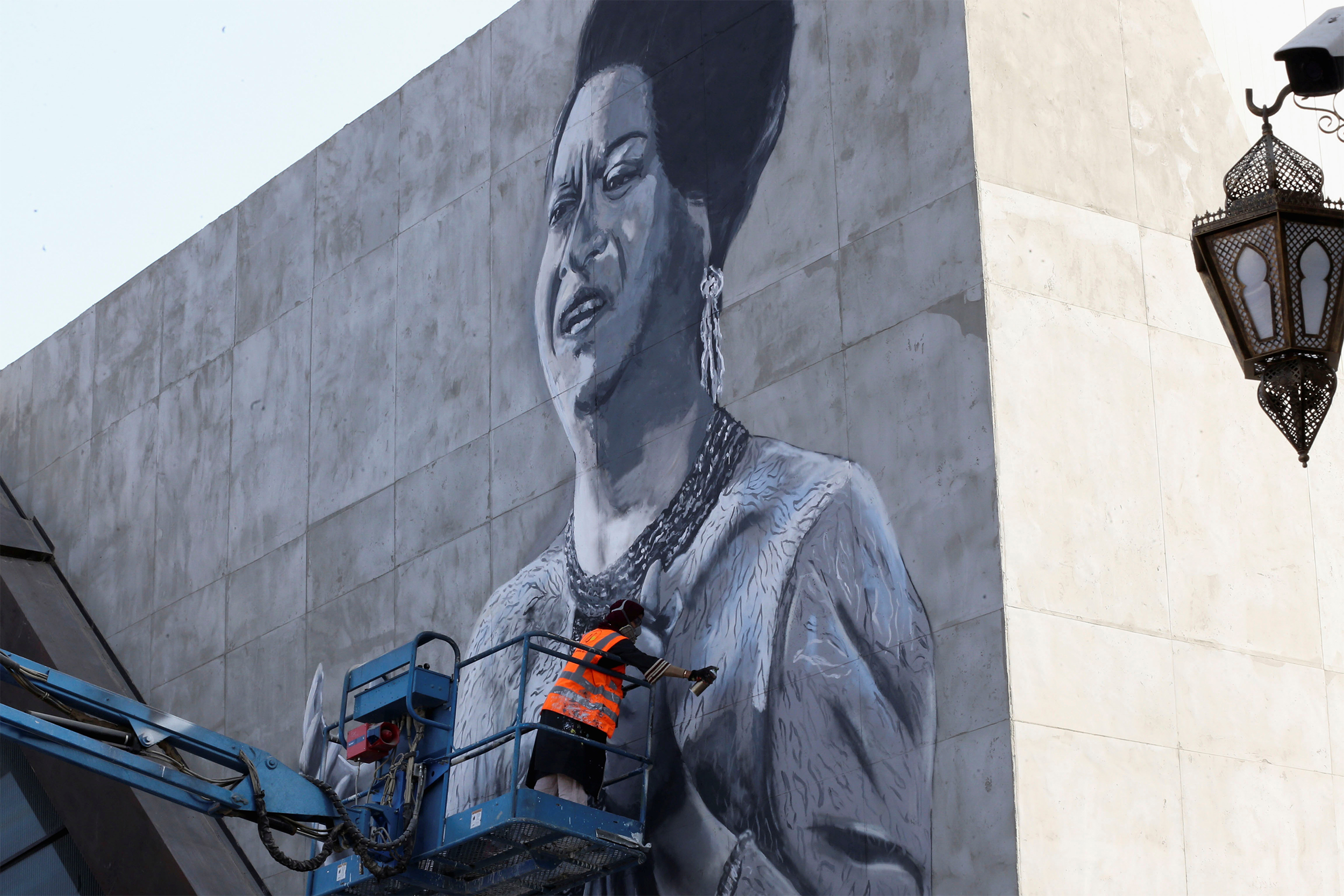 ومن بين أفضل جدارياتها، لوحة بطول 18 مترا للمطربة المصرية الشهيرة أم كلثوم.