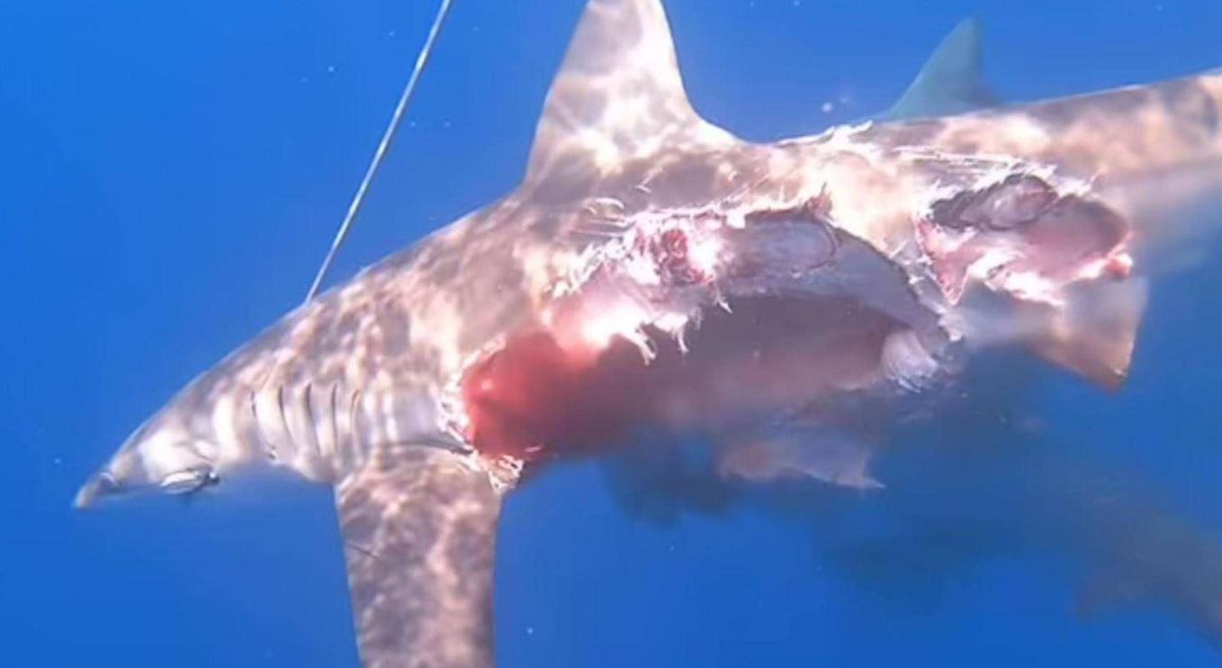 وتُظهر اللقطات سمكة القرش بعد تعرضها للهجوم الفتاك، مع قطع ضخمة ممزقة من جانبها، بينما يتدفق الدم واللحم في الماء.