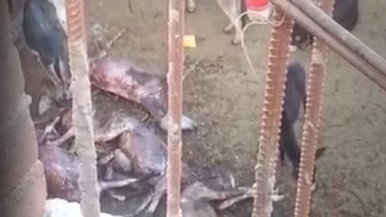 وتداول النشطاء والمدونون على مواقع التواصل الاجتماعي فيديو لحمير مسلوخة وملقاة على الأرض في أحد المنازل.
