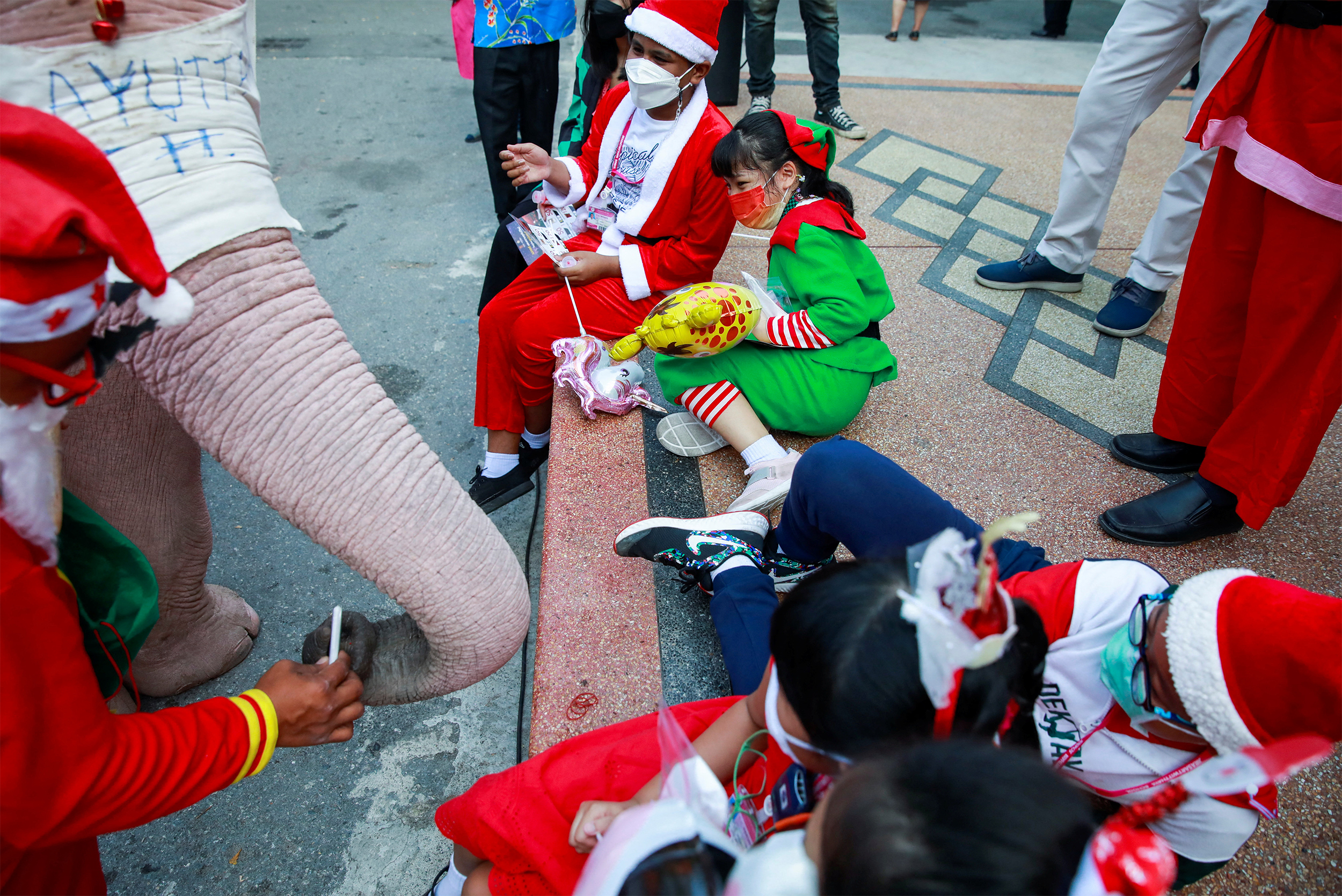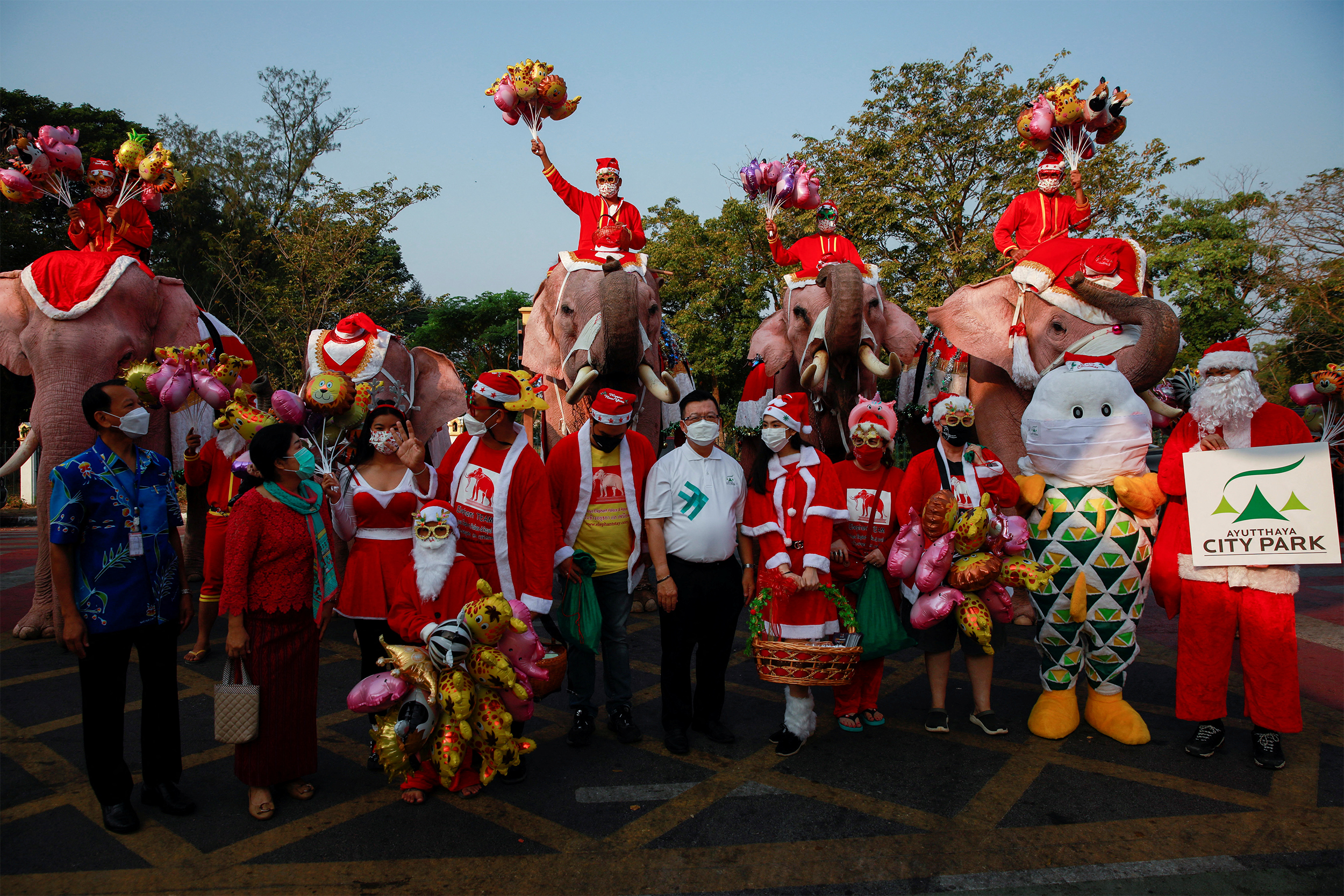قامت فيلة في تايلاند، تضع الكمامات وقبعات بابا نويل، بتوزيع المطهرات والكمامات والبالونات على تلاميذ مدرسة في الاحتفال السنوي بعيد الميلاد، في تقليد يعود إلى 15 عاما، وإن بدا مختلفا بسبب كوفيد-19.
