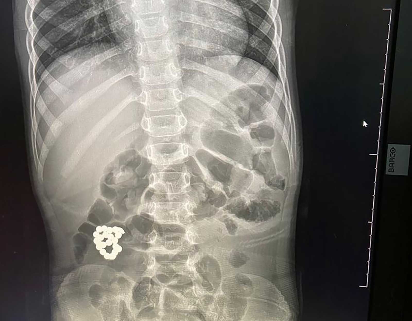 وبعد إجراء الفحوصات اللازمة، أظهرت صور الأشعة وجود جسم غريب في الأمعاء، تبين أنها"إسوارة".