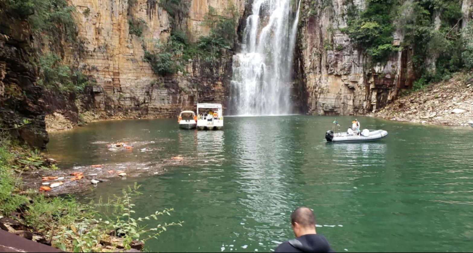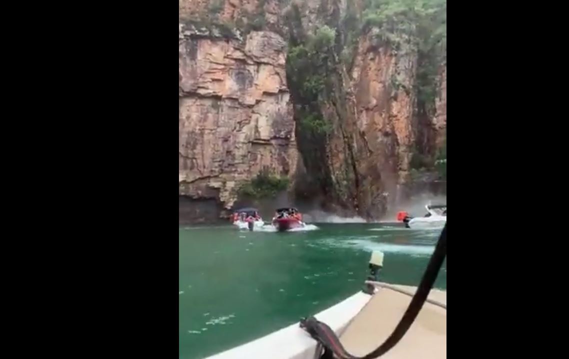 وانفصل برج من الصخور فجأة عن جدار جبلي مطل على واد ضيق وانهار على عدة قوارب سياحية، دافعا بموجة ضخمة فوق البحيرة في كابيتوليو بولاية ميناس جيرايس.