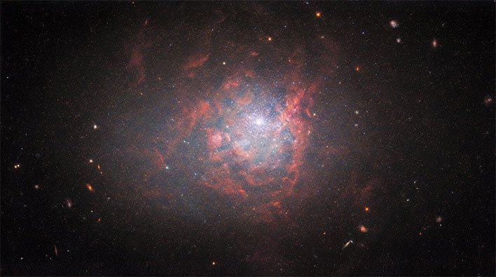 وتتألق المجرة القزمة في الصورة الجديدة، عبر سحابة من الضوء الساطع والغيوم الحمراء.