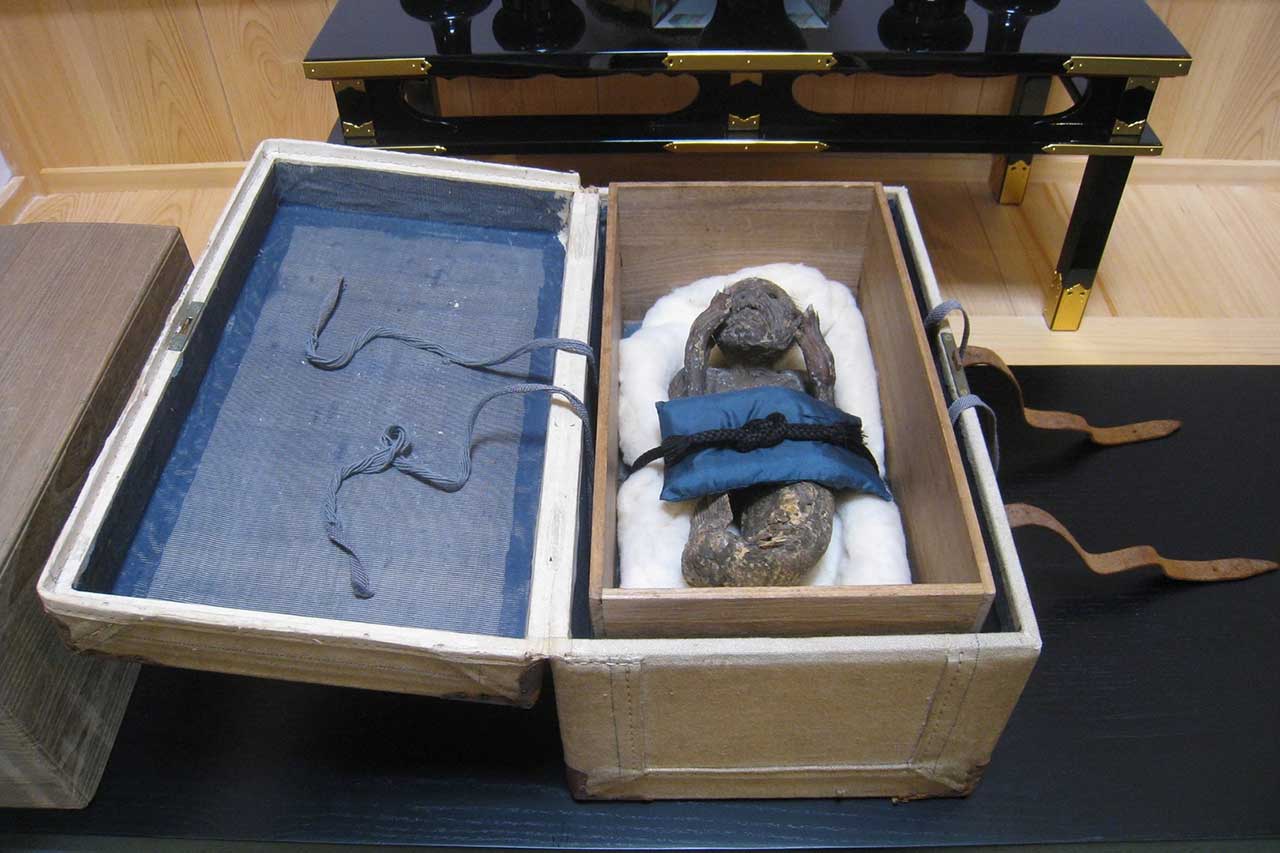 وليس من الواضح كيف ومتى جاءت المومياء إلى معبد إنجوين في أساكوتشي.