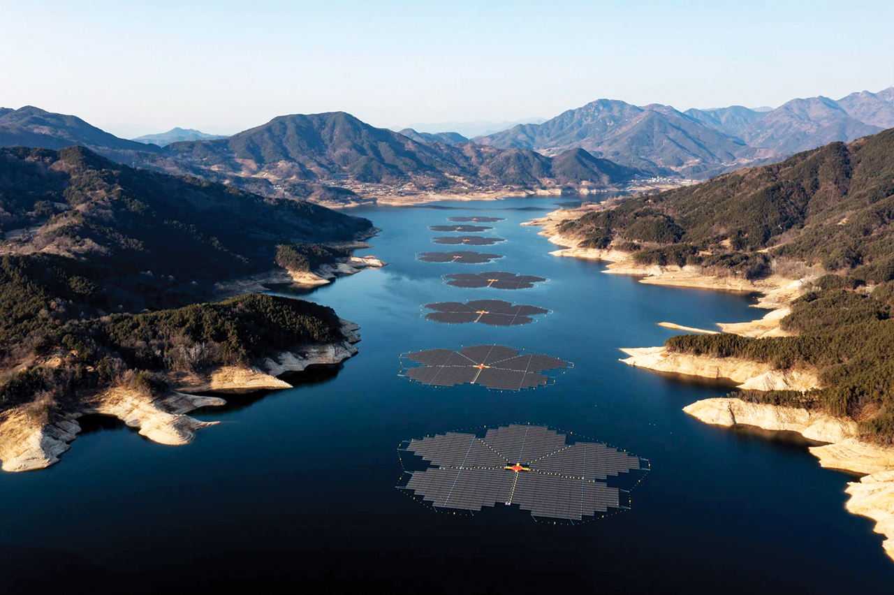 حفاظاً على مساحة اليابسة المحدودة، وعوضاً عن إخلاء العقارات المخصصة لمشاريع الطاقة المتجددة، تطفو الآن 92 ألفاً من الألواح الشمسية على شكل زهرة البرقوق فوق سطح متمايل لخزان في كوريا الجنوبية. ومشروع الطاقة الشمسية القائم على هذا الخزان الذي يبلغ طوله 17 ميلاً في محافظة هابتشون، توليد 41.5 ميغاواط، وهو ما يكفي لتزويد 60 ألف شخص بالطاقة، أكثر من إجمالي السكان في المحافظة.
