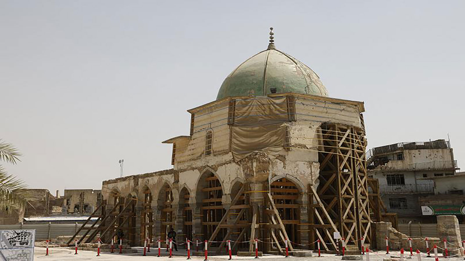 في الساحة المحيطة بمسجد النوري، لم يبق من المئذنة الحدباء التي بنيت قبل 850 عاماً سوى القاعدة، تغطيها قطعة من البلاستيك. دُمّر الموقع في العام 2017 بعدما فجره الإرهابيون، كما يقول الجيش العراقي.