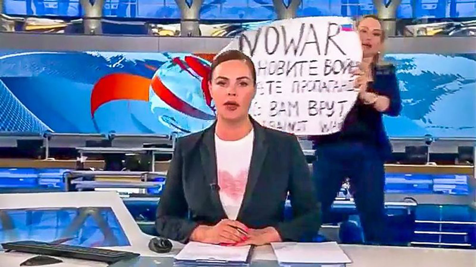 قاطعت متظاهرة مناهضة للحرب نشرة الأخبار الرئيسية على القناة التلفزيونية الحكومية الأولى في روسيا أمس الاثنين، ورفعت لافتة خلف المذيعة عليها شعارات تندد بالعملية العسكرية الروسية في أوكرانيا.