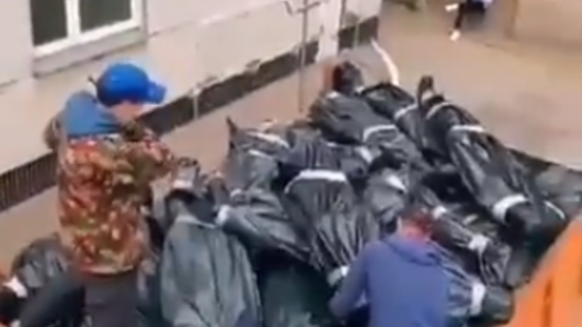 وفي المقطع الذي تبلغ مدته 12 ثانية، يرقد رجل داخل كيس أسود وذراعه في الخارج ممسكة بسيجارة مشتعلة يتصاعد منها الدخان. ويبدو أن شخصين آخرين يرتبان أكياس الجثث في الجزء الخلفي من شاحنة برتقالية خارج مبنى أبيض.