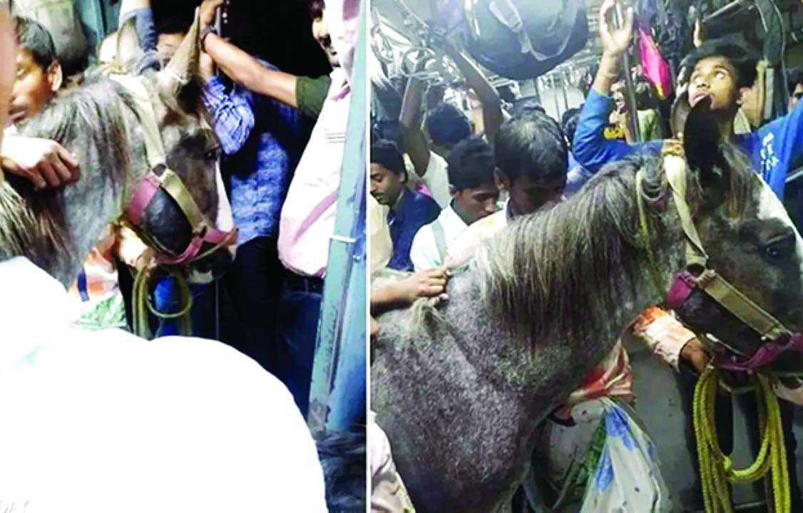 وأظهر الفيديو الذي تداوله رواد مواقع التواصل، ونشره موقع «إنديا توداي»، حصاناً في قطار مزدحم بالركاب، حسب ما ذكر موقع سكاي نيوز. وأشار بعض رواد مواقع التواصل ممن شاهدوا الفيديو، إلى أن الحصان كان مشاركاً في سباق أقيم بمنطقة بارويبور بذات اليوم الذي تم فيه نشر المقطع.