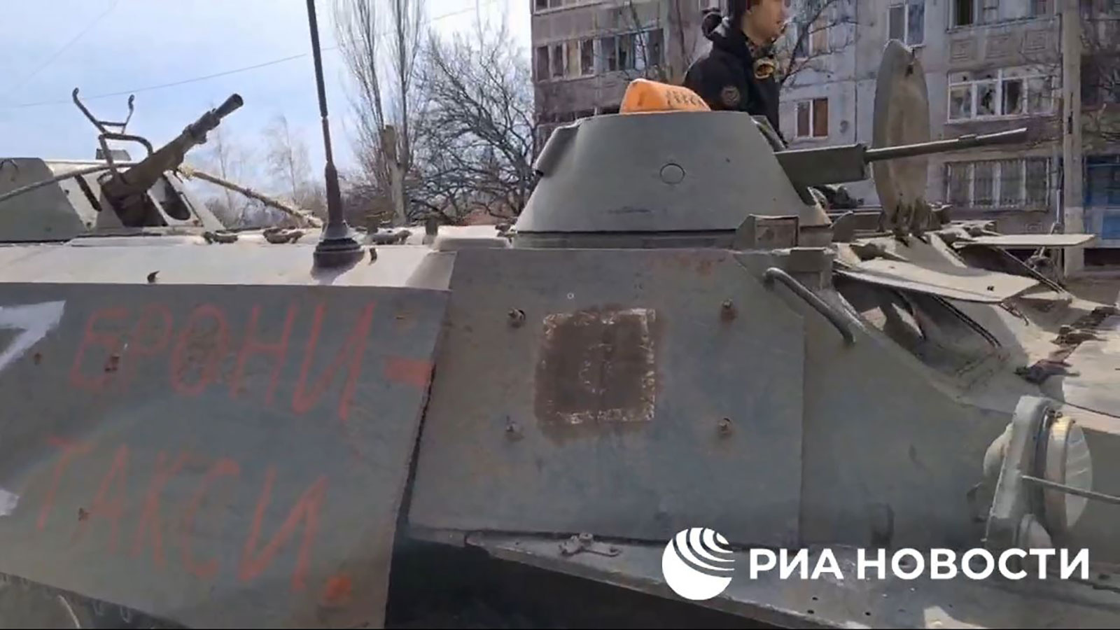 وضع عسكريو جمهورية لوغانسك الانفصالية الموالية لروسيا علامة "سيارة أجرة" على مدرعة يستخدمونها لنقل المساعدات وإجلاء الجرحى والمدنيين في مدينة بيرفومايسك قرب خطوط القتال مع الجيش الأوكراني.