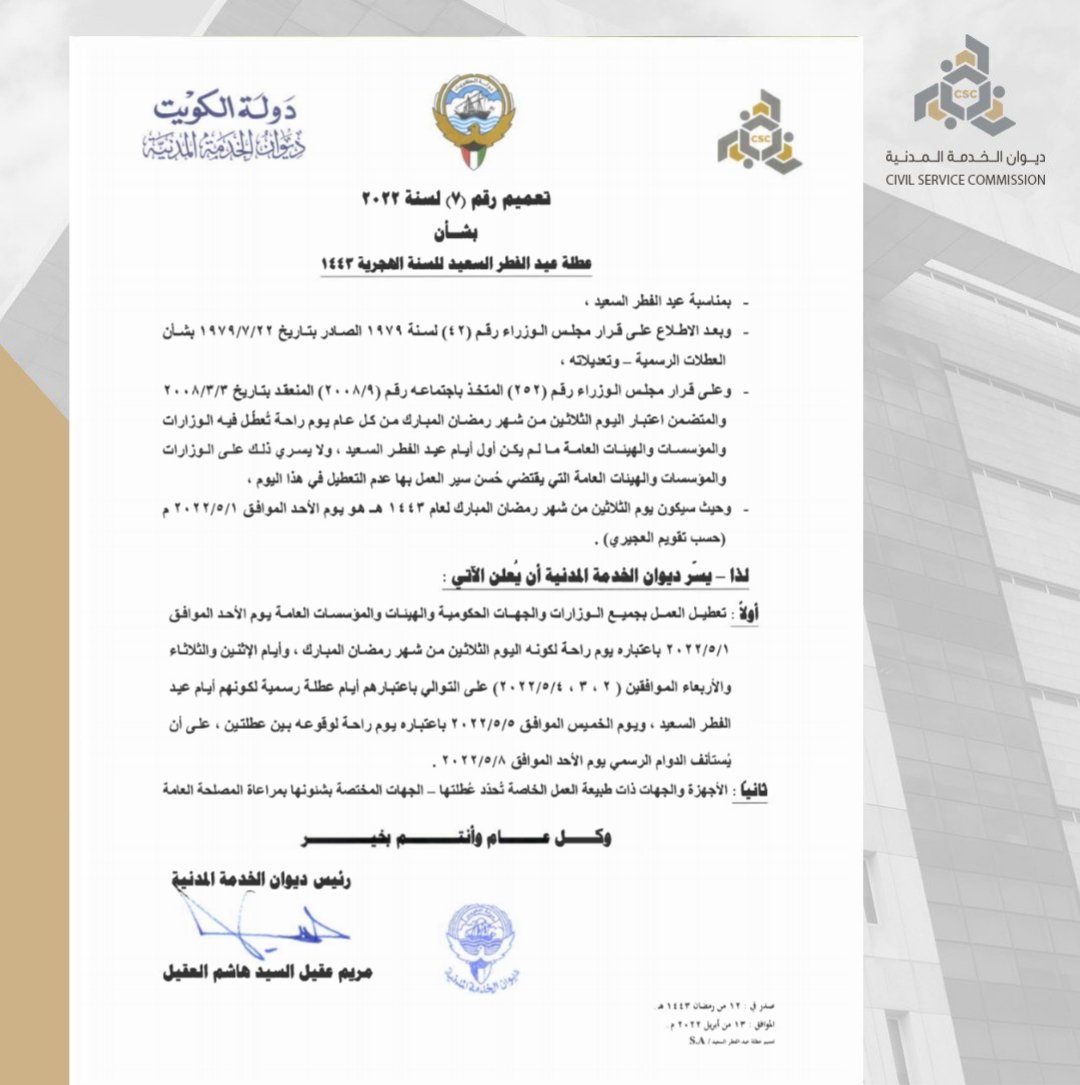 وكشف الديوان الأميري الكويتي في تعميم أصدره، أن الأحد يُعطل كونه يوم راحة باعتباره الثلاثين من رمضان، بينما أيام الاثنين والثلاثاء والأربعاء أيام عطل رسمية، كونها أيام عيد الفطر والخميس يوم راحة يقع بين عطلتين.