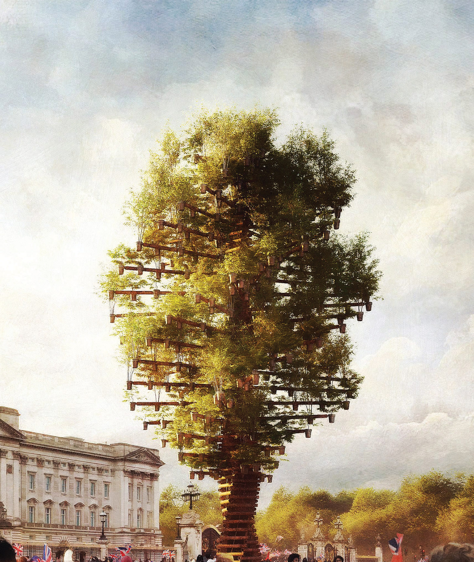 وسيُكشف عن هذا النصب في الفترة بين الثاني إلى الخامس من يونيو، التي تصادف مرور 70 عاماً على حكم إليزابيث الثانية، حيث سيرتفع على شكل شجرة عملاقة فوق القضبان أمام بوابات القصر.