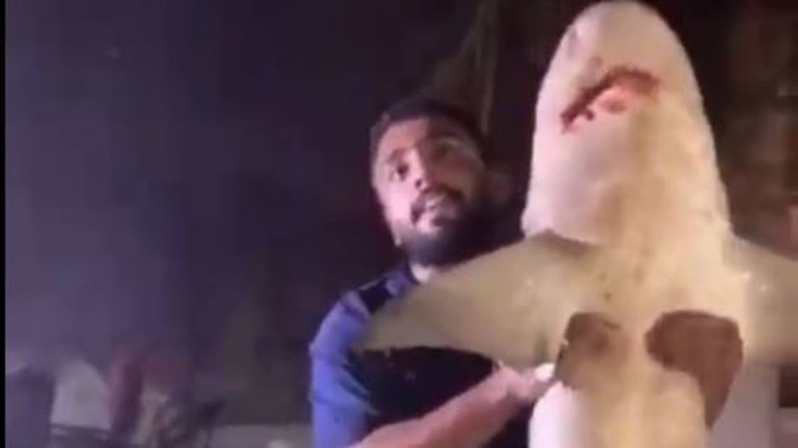 وأظهر الفيديو الشاب وهو يقوم بسحب سمكة قرش بيضاء متوسطة الحجم على الشاطئ بعدما اصطادها بصنارة.