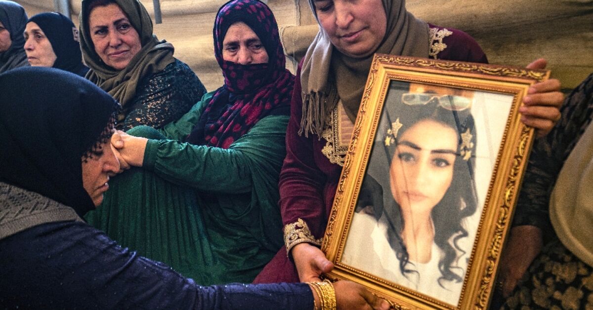 داخل خيمة العزاء في مدينة القامشلي (شمال شرق)، تحمل هيام صورة ابنتها العروس وتقول "كانت ابنتي سعيدة بخطبتها (...) كنت أتمنى رؤيتها مرتدية فستان عرسها".