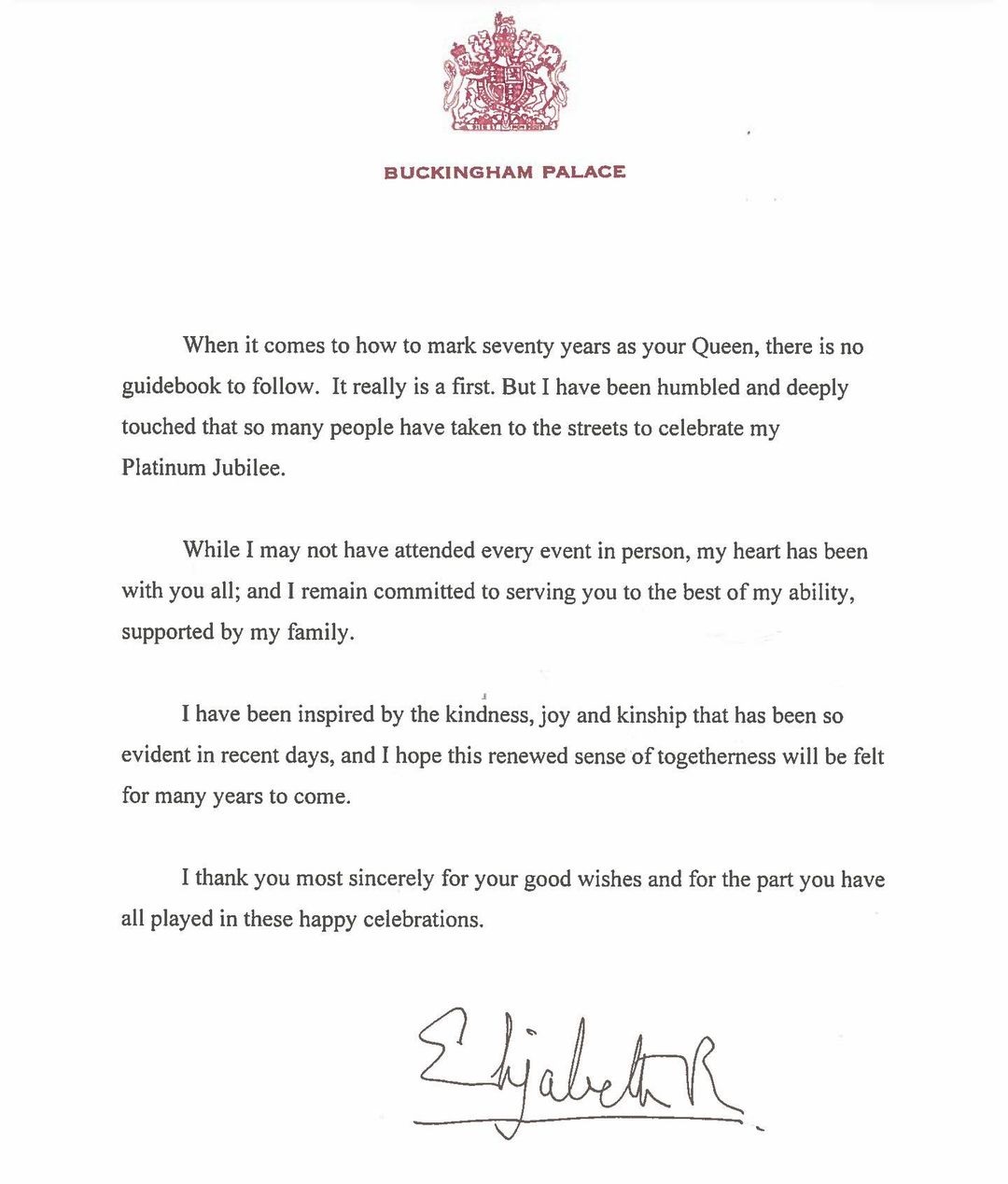 وقالت الملكة، في بيان للأمة: «عندما يتعلق الأمر بكيفية الاحتفال بمرور 70 عاماً على تولي العرش، لا يوجد دليل إرشادي يجب اتباعه... شعرت بالتأثر الشديد، لأن الكثير من الناس قد نزلوا إلى الشوارع للاحتفال باليوبيل البلاتيني».