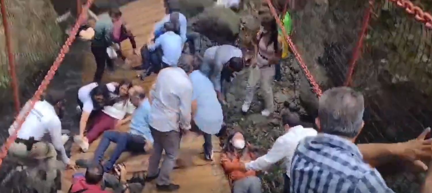 ويظهر الفيديو انهيار الجسر أثناء مرور عدد من المسؤولين من مدينة كويرنافاكا المكسيكية، خلال حفل افتتاح الجسر المُعلق.