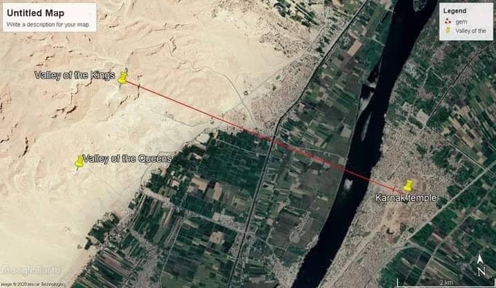 وأوضح الدكتور أحمد عوض الأكاديمي المصرى المتخصص فى رصد الظواهر الفرعونية بمعابد ومقاصير مصر القديمة، إعجاز المصري القديم، حيث أقام مقابر الملوك في موقعها بوادي الملوك على إمتداد المحور الرئيسي لمعبد "الكرنك" "بعيدا عن موقع مقابر الملكات في وادي الملكات بما يتخطى 1.5 كيلومتر"، ويميل محور معبد "الكرنك" بداية من قدس أقداسه إلى صرحيه الخارجيين بزاوية مقدارها 296.75 درجة قوسية مقاسة من باتجاه الشمال مع اتجاه حركة عقارب الساعة وهي ذات الزاوية التي تصل بين موقع معبد "الكرنك" وموقع مقابر "وادي الملوك" رغم أن المسافة بينهما تتخطى ال 6 كيلومترات.