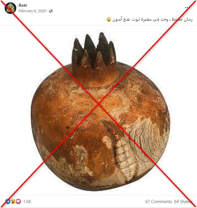 تداول رواد مواقع التواصل الاجتماعي في مصر صورة زعموا أنها لرمانة محنطة وجدت في قبر الفرعون توت عنخ آمون.