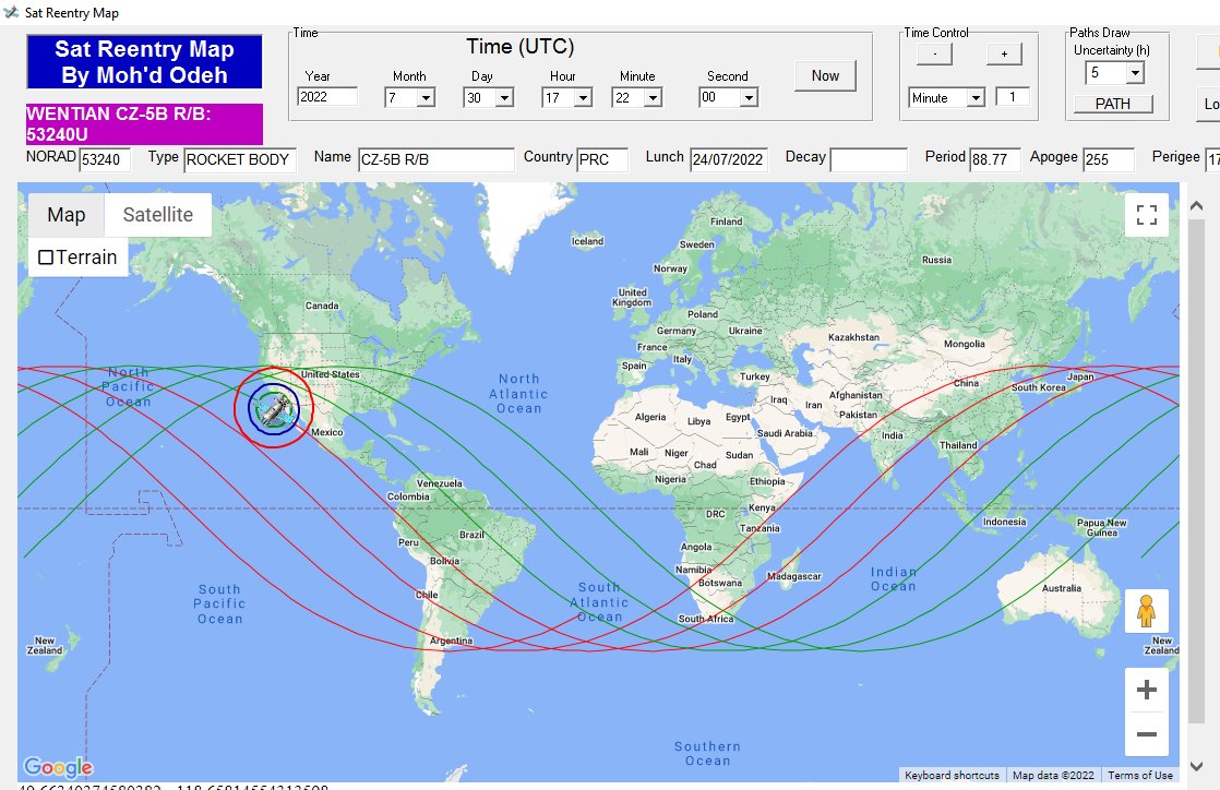 وأكد أن جميع مناطق الوطن العربي خارج منطقة السقوط ولكن هذا قد يتغير في التحديثات التالية. موضحاً أن جميع المناطق تحت الخطوط الحمراء والخضراء مرشحة لسقوط الحطام فوقها.