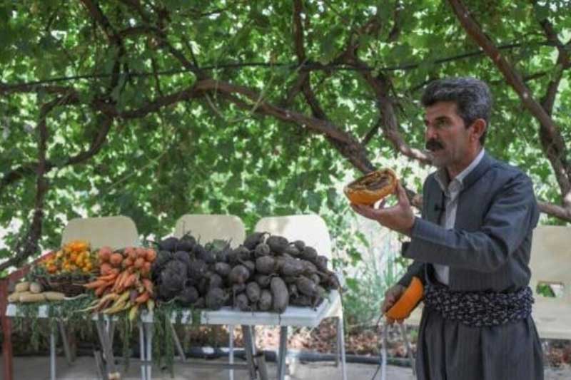 وفي أحد المقاطع، يشرح المزارع الذي حلق ذقنه بعناية وأبقى على شارب صغير مرتدياً زياً كردياً تقليدياً أنيقاً، الفرق بين نوعين من البصل، حصدهما للتو من أرضه.