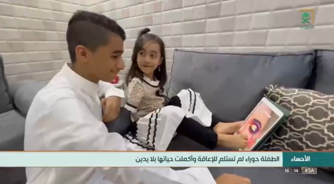 حوراء البخيت طفلة بلا يدين تبلغ من العمر 7 سنوات وتعيش مع أسرتها في بلدة الرميلة شرق الأحساء، تغلبت على إعاقتها الحركية لتمارس حياتها بإرادة صلبة، وعزيمة قوية وتعيش تفاصيل حياتها الطبيعية اليومية مستخدمة أرجلها بعد أن وُلدت بلا ذراعين. وفقاً لتقرير "قناة السعودية".
