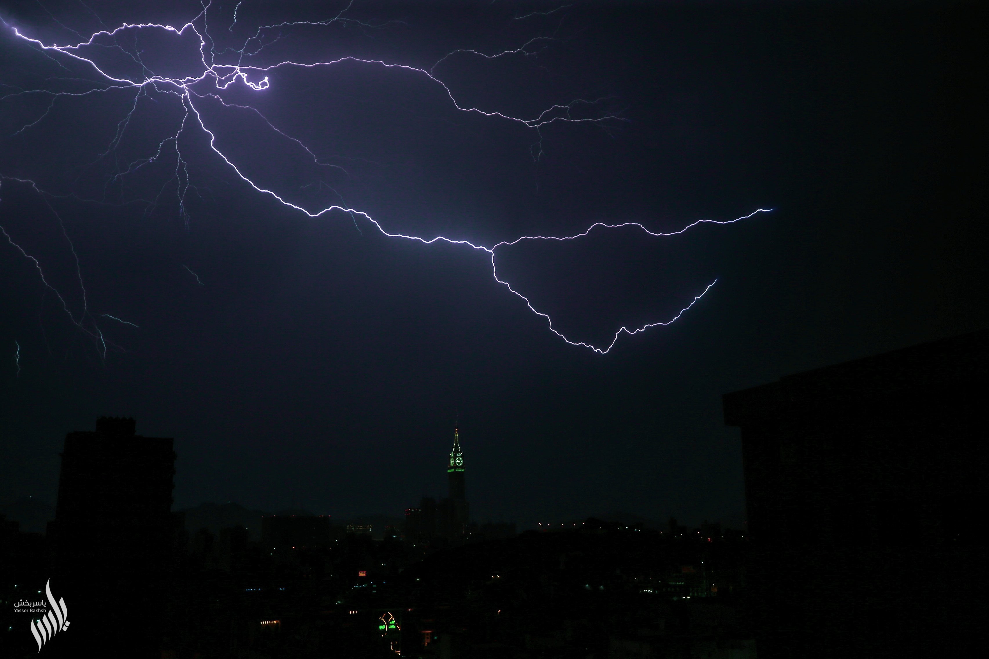 ويظهر في الفيديو المتداول المشهد المهيب للصاعقة وهي تضرب برج الساعة وتمتد ضاربة في سماء مكة لتحولها إلى نهار للحظات.