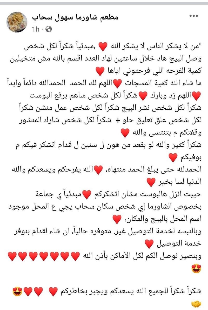 وفي أقل من ساعات من نشر المناشدة انهالت طلبات الشراء على المطعم الكائن جنوب العاصمة عمان، والذي أصبح حديث الرأي العام.