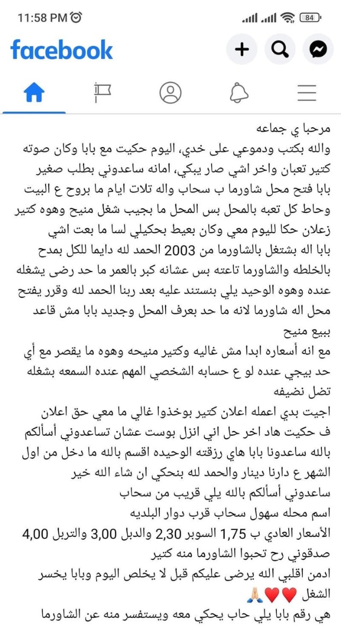 تفاعل عدد كبير من رواد منصات التواصل الإجتماعي في الأردن مع قصة مطعم سهول سحاب، بعد مانشرت ابنة صاحب المطعم رسالة مؤثرة على حسابها في فيسبوك لإنقاذ مطعم والدها من الإفلاس.