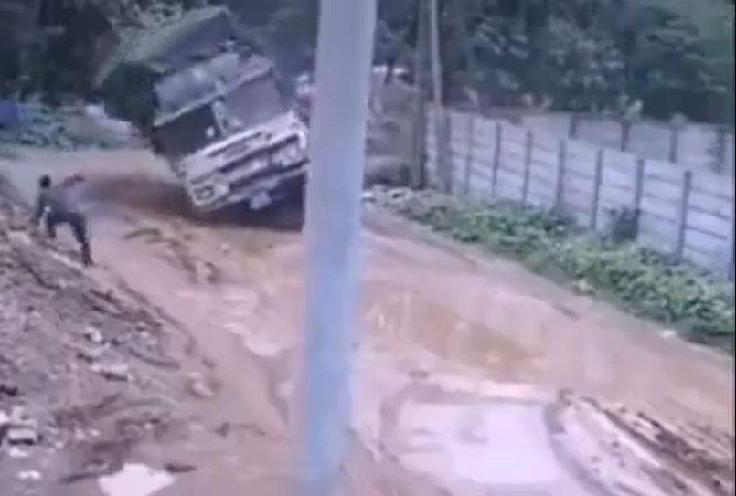 تداول رواد مواقع التواصل الاجتماعي "تويتر" مقطع فيديو يظهر سائقا يعبر بشاحنته أحد المنعطفات الخطرة، بينما كانت شاحنته تنوء بحمولة ثقيلة جداً، ما أدى إلى انقلابها وانشطارها إلى نصفين.