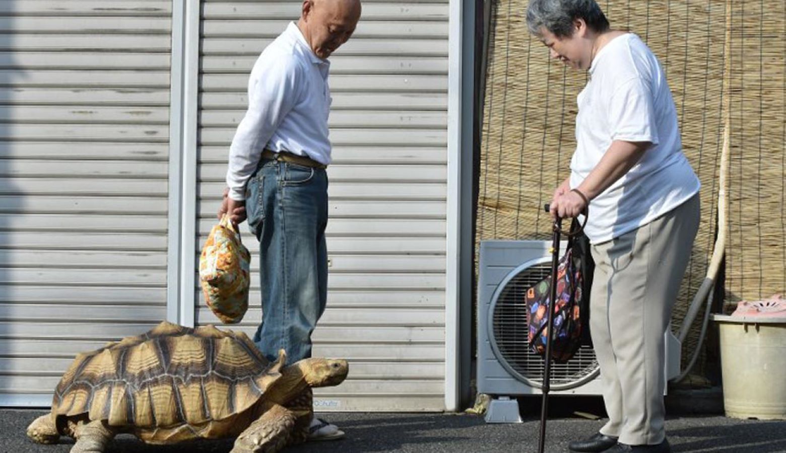 يعتني هذا المسن الياباني بهذه السلحفاة الأفريقية وكأنها حيوان أليف.
