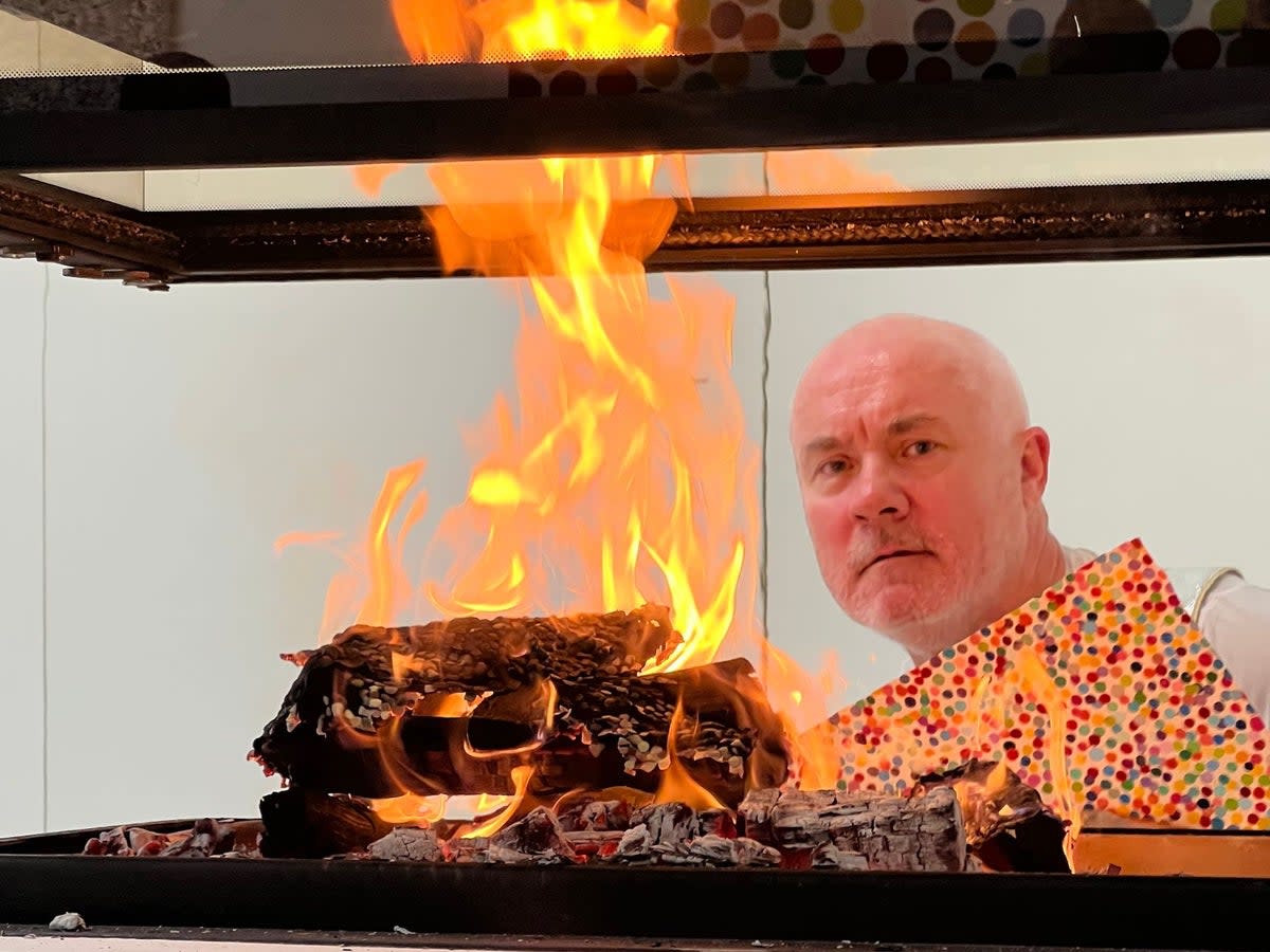 واقترب داميان هيرست المعروف بأسلوبه الاستفزازي مرتدياً بزة سالوبيت فضية اللون من الموقدة، وأحرق أمام عشرات الأشخاص الذين كانوا حاضرين أو يتابعون وقائع ما يجري في بثّ مباشر عبر إنستغرام، أعماله المُنجزة على أوراق بقياس "ايه 4" والتي تتشابه فيما بينها لإظهارها نقاطاً متعددة الألوان.