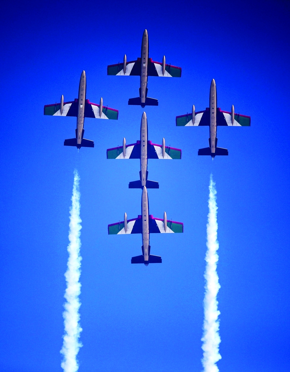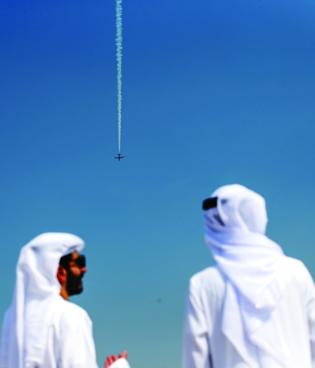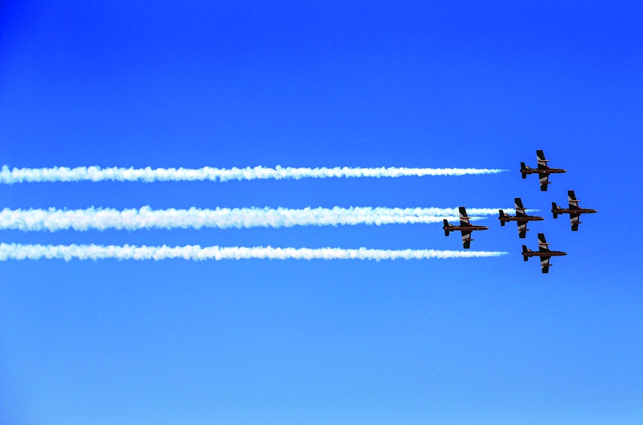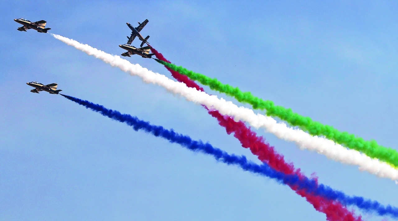 لوحات ملونة رسمها أعضاء فريق الفرسان للاستعراضات الجوية لدولة الإمارات في عرض قدموه ترحيباً بزوار معرض أبوظبي للطيران، الذي يجمع تحت مظلته 200 عارض وشركة من قطاعَي الطيران وعلوم الفضاء.
