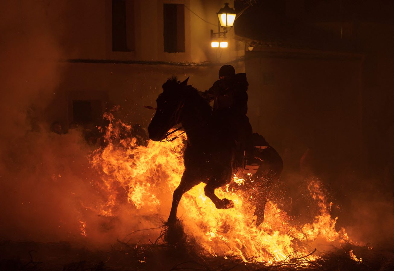 في طقس احتفالي يغمره دخان تنفثه ألسنةُ لهب تتراقص برشاقةٍ تحت سنابك الخيل، افترش مهرجان "لوميناريس" السنوي شوارع قرية سان بارتولوميه دي بيناريس القريبة من العاصمة الإسبانية يوم أول أمس الاثنين.