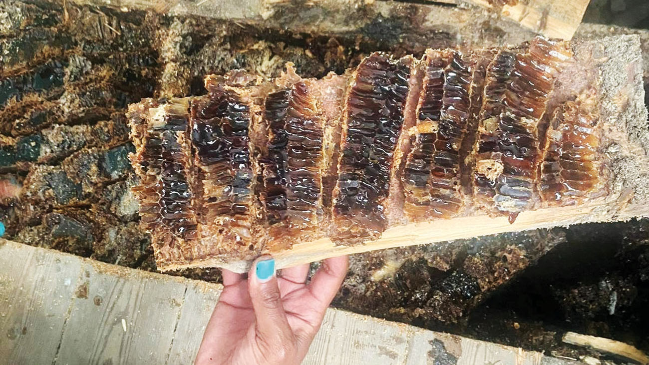 وقررت كيت أن تزيل الألواح الخشبية في الأرضية لتعثر على خلية نحل بطول ست أقدام (1.8 متر) مع ليترات من العسل.