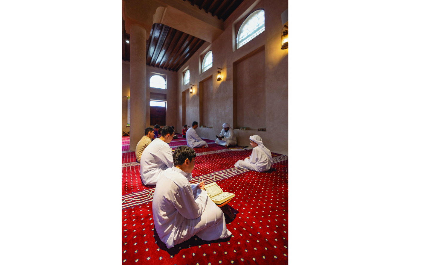 مجموعة من المصلين من فئات عمرية مختلفة، يقرأون القرآن الكريم في مسجد العفة بالذيد في إمارة الشارقة. ويحرص أبناء المجتمع الإماراتي وجميع المقيمين فيه من المسلمين، على التعبد والتهجد في المساجد خلال أيام وليالي رمضان المبارك، لنيل الأجر والثواب في الشهر الفضيل.