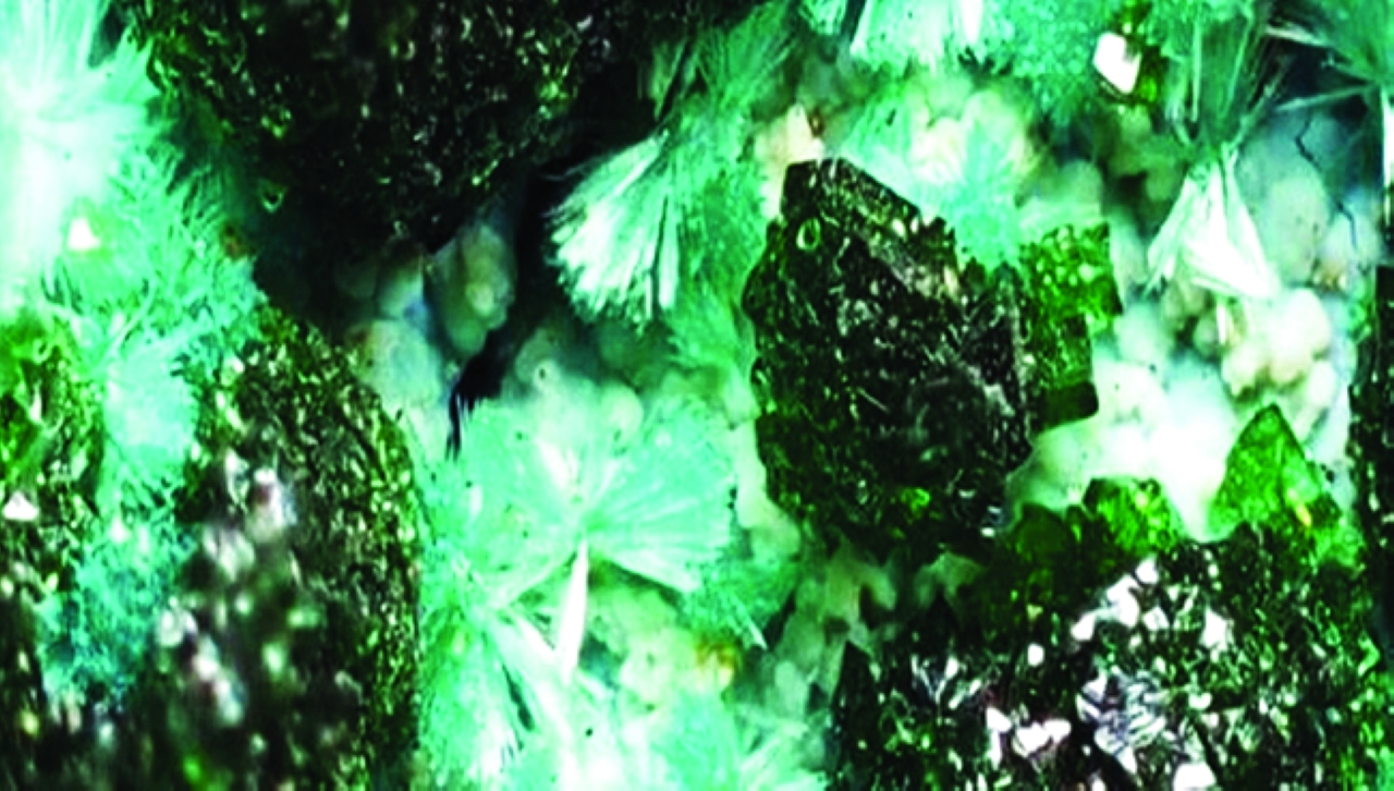 ويشبه معدن إيتيريوم الصخري فروع شجرة التنوب الخضراء باهتة اللون.