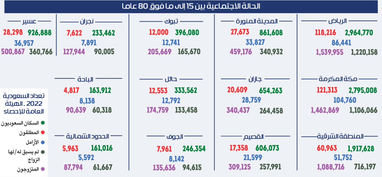 أما في الرياض فكان عدد المطلقين 118.216، والأرامل 86.441، ومن لم يسبق لهم الزواج 1.220.158، والمتزوجون 1.539.955، وذلك وفقاً لبيانات الهيئة العامة للإحصاء السعودية.