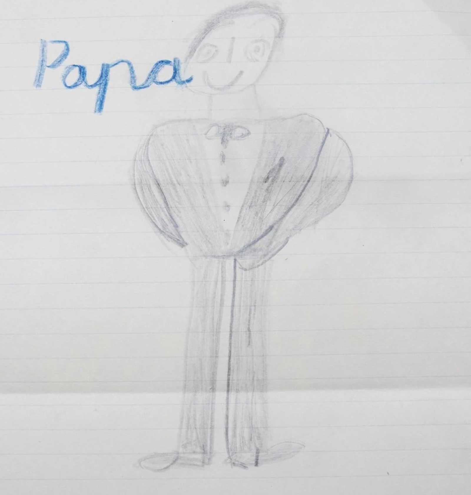 وتبدو رسمة والد تشارلز أقل ألواناً بكثير، برغم ظهوره مبتسماً فيها، ففي الصورة يرتدي بدلة رسمية وربطة عنق.