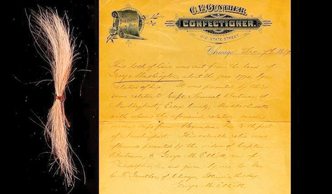 أفاد موقع متخصص، أخيراً، بوجود خصلة من شعر جورج واشنطن ملفوفة بشكل بيضوي، وموضوعة في علبة زجاجية صغيرة تحيط بها حبّات اللؤلؤ من كل الجهات، حيث إنها معروضة للبيع، طبقاً لما أوضحه موقع «24» نقلاً عن موقع «تمز» «Tmz»، معروضة في مزاد مقابل 45 ألف دولار. وقد نقشت على الجزء الخلفي من العلبة الأحرف الأولى من اسمه «GW».