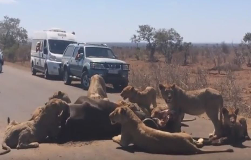 وكشف مقطع الفيديو الذي صوره أحد المرشدين السياحيين بالقرب من محمية طبيعية في جنوب إفريقيا، لحظة تجمع حوالي 15 أسداً حول فريسة والتهامها لها بشراهة على مرأى من العديد من سائقي السيارات الذين توقفوا على مسافة قريبة من الأسود الضارية وفقا لموقع 24 الإخباري.