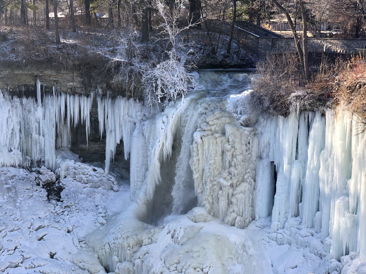 FROZEN FALLS - How "cool" is this?? Almost everything is frozen at Minnehaha Falls in Minneapolis, Minnesota! #mnwx pic.twitter.com/70MdOOx2Ca