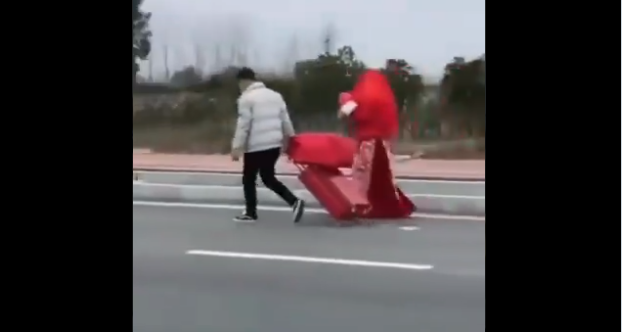 ووفقاً لمواقع صينية تداولت الفيديو، فقد توقفت سيارة للشرطة بعدما لمحت العروسين وهما يمشيان على الطريق السريع الخالي من السيارات، حاملين حقيبة، فاقتربت منهما ونقلتهما إلى بيت الزوجية.