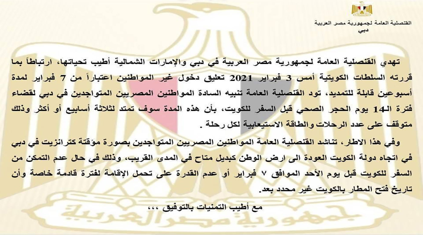 وتهيب القنصلية العامة بدبي للمصريين المتواجدين في دبي لقضاء فترة الـ 15 يوما من الحجر الصحي قبل السفر إلى الكويت بأن هذه المدة سوف تمتد لثلاثة أسابيع أو أكثر، وذلك متوقف على عدد الرحلات والطاقة الاستيعابية لكل رحلة.