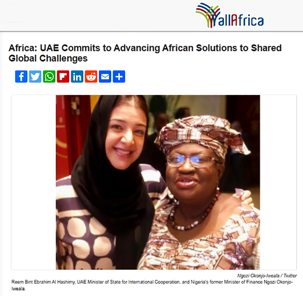 نشر موقع «أول أفريكا» مقالاً لمعالي ريم بنت إبراهيم الهاشمي، وزيرة دولة لشؤون التعاون الدولي، والتي تشغل أيضاً منصب المدير العام لمكتب إكسبو 2020 دبي، افتتحته بالإشارة إلى أن الخلاصة التي توصلت إليها قمة الاتحاد الإفريقي أخيراً، أمر يستوجب التوقف عنده وتأمل خطوات التغيير التي تعبر القارة، والصداقة التي تربط الإمارات بشعب القارة السمراء.