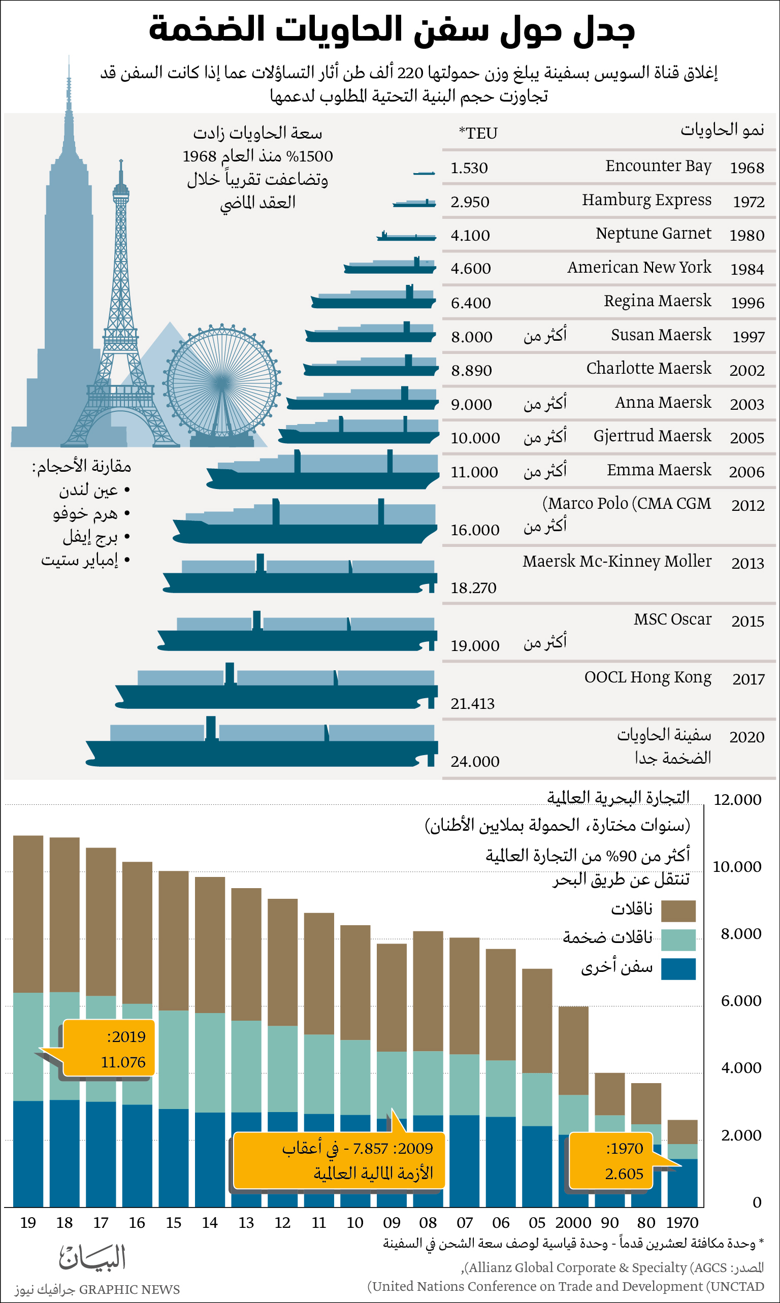 وقال بيتر داونسند الخبير المتمرس بقطاع التأمين البحري «زاد متوسط حجم معظم السفن باطراد على مدى السنوات الـ15 الأخيرة، بينما لم تزد القدرة على إنقاذ هذه السفن الأكبر». وأضاف «المشكلة في إنزال الحاويات من على ارتفاع 20 طابقاً في عرض البحر».