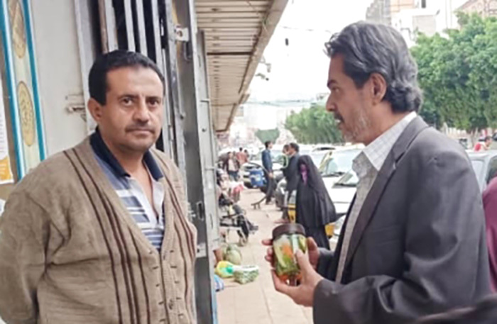 بالقرب من سوبر ماركت شهير في شارع الزبيري وسط صنعاء. يقف رضوان المسؤول السابق في هيئة الاستثمار عارضاً على المارة بضاعته من أنواع المخلل، حيث اضطر وبعد اربع سنوات على إيقاف ميليشيا الحوثي رواتب الموظفين إلى هذا العمل لتغطية نفقات أسرته. الرجل بلباقته وهندامه لفت أنظار الزبائن وتداول النشطاء صوره في مواقع التواصل الاجتماعي ما ساهم في زيادة الإقبال على المنتج الذي يتم إعداده في منزله ومن ثم بيعه، وأصبح موقعه عند مدخل السوبر ماركت مزار الكثيرين سواء ممن يريد الشراء أو من الفضوليين الذين يريدون سماع قصته.