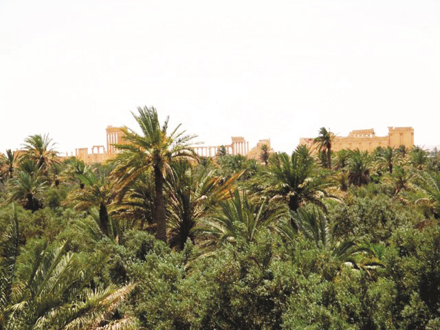 وفي مكان من الأماكن قدماً وعراقة، تعيش مدينة تدمر بواحات نخيلها أسوأ حقبها بعد اندثار الواحات وتحولها إلى ساحات قتال بل وأوكار للمتطرفين. تشكّل واحات النخيل في تدمر أحد أبرز المعالم الحضارية التاريخية في المدينة، إذ تتربّع الواحات في وسط الصحراء الفقيرة بالمياه على مدار العام بلونها الأخضر الرمادي في صورة نادرة من صور الصحراء السورية.