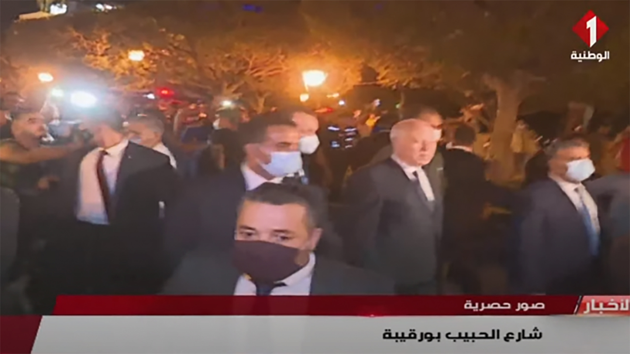 عرض التلفزيون التونسي صورا للرئيس قيس سعيد يشارك حشدا يحتفل بقراره بإقالة رئيس الحكومة وتعليق عمل البرلمان في شارع الحبيب بورقيبة بوسط العاصمة في ساعة مبكرة من صباح اليوم الاثنين.