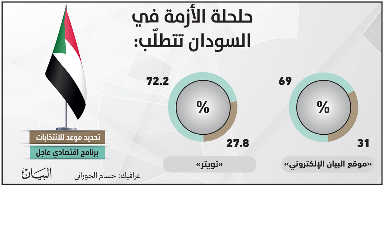 أظهر استطلاع للرأي، أجرته «البيان» عبر موقعها الالكتروني وحسابها على موقع التواصل الاجتماعي «تويتر»، أنّ حل الأزمة في السودان يتطلّب برنامجاً اقتصادياً عاجلاً أكثر منه تحديد موعد لإجراء الانتخابات، إذ ذهب 69 في المئة من المستطلعين عبر الموقع إلى تبني هذا الرأي، مقابل 31 في المئة. وفي تصويت مقارب، لفت 72.2 في المئة من المستطلعين على «تويتر»، إلى أنّ البرنامج الاقتصادي هو الأساس لحل الأزمة في السودان، فيما أشار 27.8 في المئة إلى أنّ الانتخابات هي التي ستعيد الأمور إلى نصابها. وأكّد الخبير الاستراتيجي د. بشير الدعجة، أنّ خروج السودان من أزمته الماثلة رهن بالسعي نحو إنهاء الانقسامات والتجاذبات الدائرة بين مختلف القوى السياسية، ومن ثمّ التوافق على موعد لإجراء انتخابات نزيهة وشفافة، مشيراً إلى أنّ القيادة التي سيتم انتخابها سيكون على عاتقها مهام إعداد استراتيجيات وخطط لإعادة ترتيب الأوضاع الاقتصادية والسياسية.